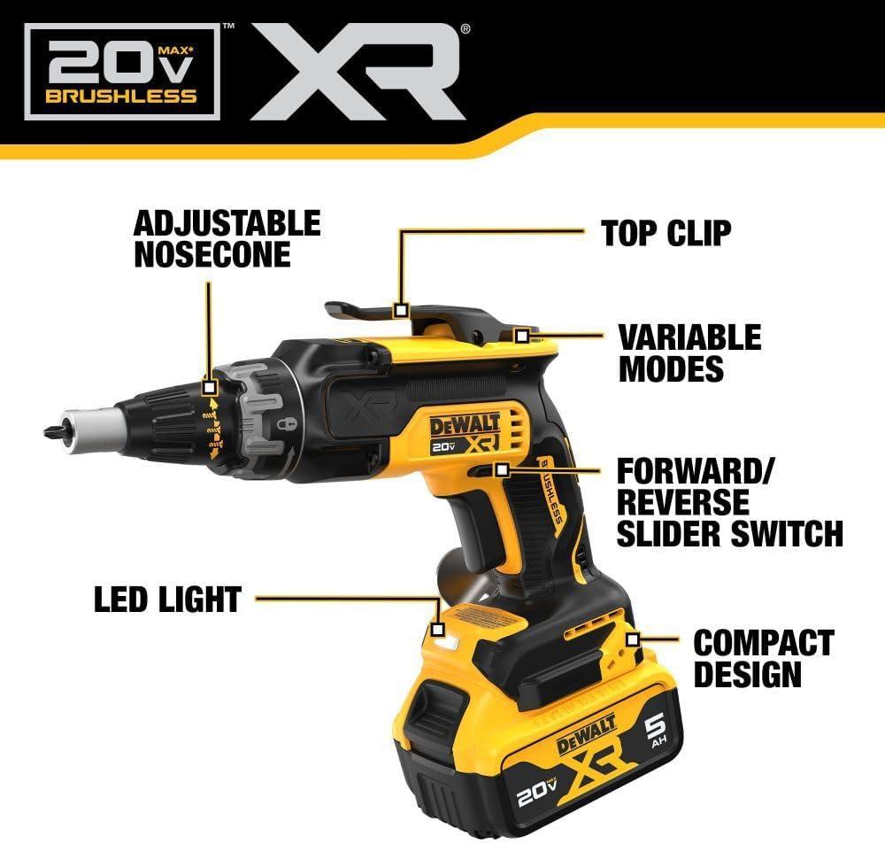 The DCF630 Brushless Drywall Screwgun features a brushless motor and electronic mode select to help optimize usage in a range of drywall hanging applications. Four dedicated tool modes enable operation of the screwgun in Trigger Mode (High Speed), Trigger Mode (Low Speed), PushStart Mode, and Lock-On Mode. A top-mounted electronic mode select enables fast, one-handed switching between the tool's four modes. The DCF630's compact size and weight are designed to reduce fatigue during periods of extended usage, while its wide upper grip flange enables secure placement of thumb and forefinger. The DCE555 Drywall Cut-Out Tool features a 26,000 RPM brushless motor, which delivers fast and consistent cutting performance in a variety of drywall and paneling applications. The tool features tool-free bit change, enabling fast and secure bit and collet changes without the need for a wrench. A forward-positioned on-off button is designed for easy and ergonomic usage.