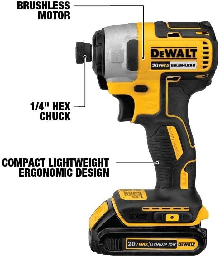 DCF787C1 Brushless Cordless Impact Driver is powered by a 20V MAX battery (1.3 Ah battery included). The Impact Driver's compact and lightweight design allows the tool to be utilized in tight areas while the LED light provide visibility in low lit areas.