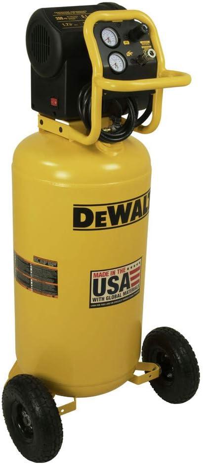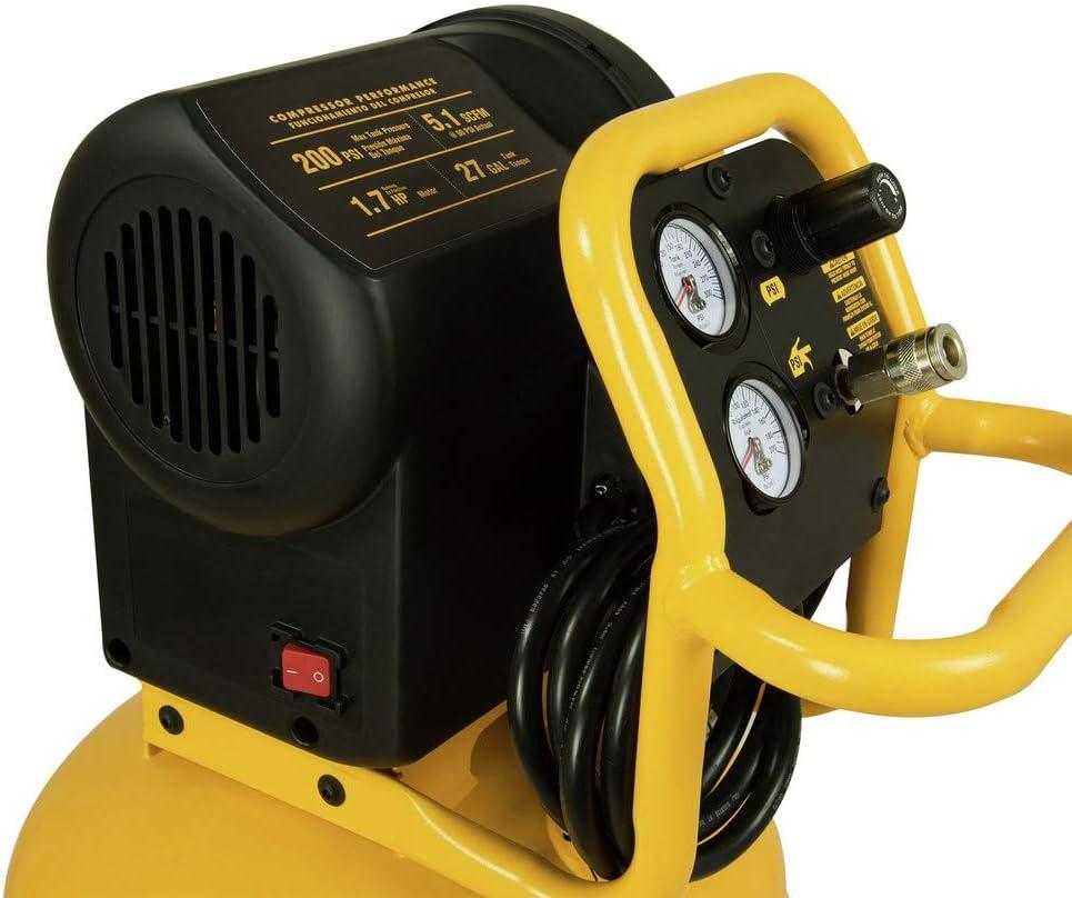DEWALT 1.7 HP 27 Gallon Oil-Free Vertical Air Compressor, the ultimate solution for your home improvement and garage needs. Engineered for excellence, this air compressor is designed to deliver unparalleled performance and reliability, making it an indispensable tool for both professionals and DIY enthusiasts. With a powerful 1.7 HP motor and a generous 27-gallon capacity, this electric air compressor ensures you have ample air supply for a variety of tasks, from inflating tires to powering pneumatic tools. One of the standout features of this portable air compressor is its oil-free operation, which not only reduces maintenance requirements but also ensures a cleaner air supply. The low volt easy start motor is a testament to its user-friendly design, allowing for seamless operation even in low voltage conditions, making it an ideal choice for any home garage. Operating at only 78 dBA, the DEWALT air compressor offers a quieter working environment, making it suitable for indoor use without causing disruption. Performance is at the heart of this air compressor, boasting an impressive 5.1 SCFM at 90 PSI and 6.8 SCFM at 40 PSI. This ensures optimal airflow and pressure for a wide range of applications, enhancing efficiency and productivity. The vertical design of this garage air compressor not only saves space but also provides easy mobility, thanks to its sturdy wheels and handle, ensuring you can transport it effortlessly around your workspace. Designed with the user in mind, the DEWALT air compressor is a versatile tool that adapts to your needs, whether you're using it as a home air compressor or in a professional setting. With a 110V power requirement, it offers compatibility with standard household outlets, making it a convenient addition to your home improvement arsenal. Trust in DEWALT's legacy of quality and innovation to deliver an air compressor portable enough for any task, yet powerful enough to meet the demands of your projects.