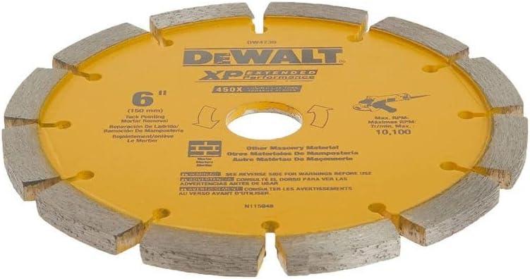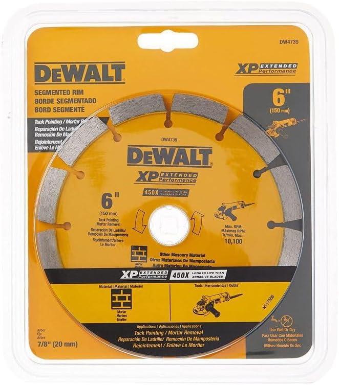 DEWALT DW4739 6-Inch x 0.250 XP Diamond Tuck Point Blades are designed for extended performance with a diamond matrix for long life and enhanced material cutting. Segmented rim blades are laser welded with heat treated steel bodies which provides increase durability and long life. This blade features large diamond segments with cobalt ideal for use across various product applications such as dry cutting concrete, stone and brick, and for fast rough cutting. Diameter: 6 inches / Edge Thickness: 0.250-Inch / Segment Height: 8 mm / Max rpm: 12,200.